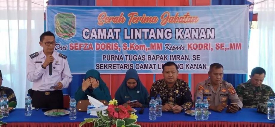 Empat Lawang, SKI – Camat Lintang kanan serah terima jabatan dari Sefza Doris,. S.Kom. MM, Dengan Pejabat Camat Baru Kodri. SE.MM kegiatan ini dihadiri Polsek lintang kanan, Danramil lintang kanan, para Kepala Desa se kecamatan Lintang Kanan, Ketua TP PKK, Kepala UPTD Puskesmas, Pendamping Desa, staf kantor camat dan tamu yang sesuai undangan. Bertempat di Aula kantor Camat Lintang kanan, Jum’at (22/9/2023).