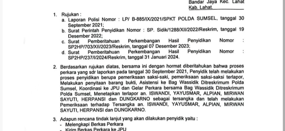 “Lahat 15 Maret 2024,Surat SP2HP/237.a/lll/2024/Reskrim, Laporan Polisi Nomor: LP/B-885/IX/2021/SPKT Polda Sumatera Selatan tanggal 30 september 2021.
