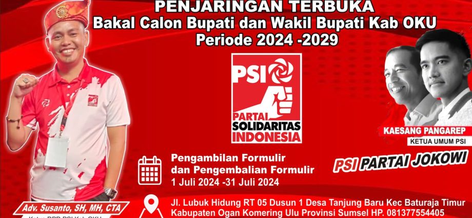 Baturaja, SKI – Dewan Pimpinan Daerah (DPD) Partai solidaritas Indonesia (PSI) Kabupaten ogan Komering Ulu membuka pendaftaran sekaligus menjaring bakal calon Bupati dan calon Wakil Bupati OKU tahun 2024 sebagai partai pedukung.,Pembukaan pendaftaran pasangan calon bupati dan calon wakil bupati yang di mulai hari senin tanggal 1 Juli 2024 sampai dengan hari rabu tanggal 31 Juli 2024 mendatang Bertempat di sekretariat Partai solidaritas Indonesia di Jl lubuk Hidung RT 05 Dusun 1 Desa tanjung baru kecamatan Baturaja timur Kabupaten ogan komering Ulu provinsi Sumatera selatanMaksud dan tujuan membuka pendaftaran bakal Calon Bupati dan Wakil Bupati ini selain untuk menjaring paslon yang berkualitas dan berintegritas untuk OKU, juga untuk menjalin hubungan kerjasama dengan beberapa paslon guna menyatukan visi dan misi untuk kemajuan wilayah kabupaten OKU.