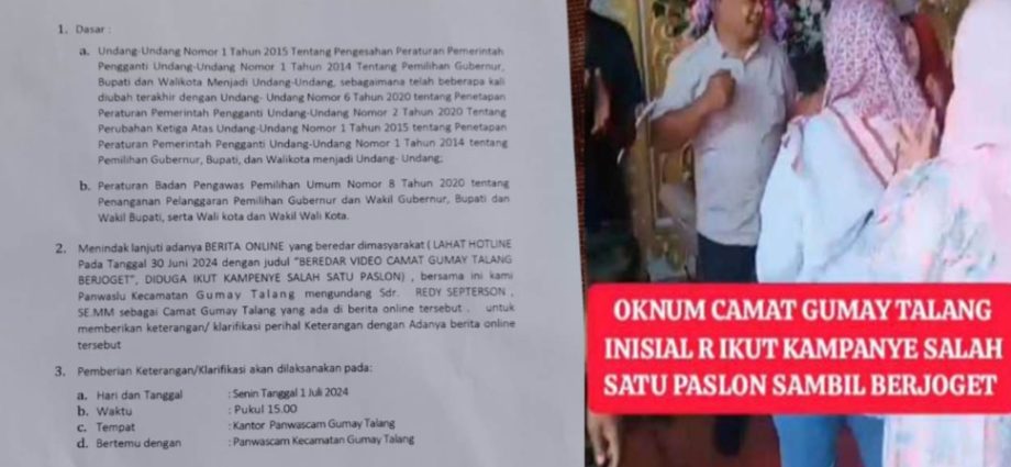 “Dalam isi surat itu, Panwaslu meminta kehadiran Camat Gumay Talang guna mengklarifikasi terkait dugaan keterlibatannya ikut dalam acara salah satu kandidat Calon Bupati dan Wakil Bupati Lahat.