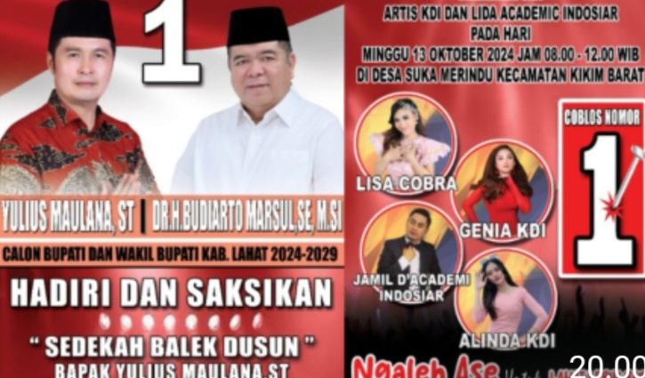 Lahat,SKI – Besok Minggu (12/10), pasangan Calon Bupati dan Wakil Bupati Lahat Yulius Maulana,ST dan DR H Budiarto Marsul,SE.,M.Si akan melaksanakan kegiatan kampanye di Desa Suka Merindu Kikim Barat, dengan kemasan Sedekah Balek Dusun.