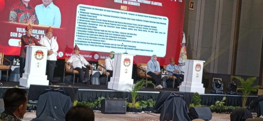 LAHAT,SKI – Debat Kandidat Calon Bupati dan Wakil Bupati Lahat Tahap I usai sudah dilaksanakan di Santika Hotel, Selasa (12/11/24). Tampak hadir dalam debat yang di mulai sekitar pukul 19.00 tersebut, Yulius Maulana, ST – Budiarto Marsul (YM-BM), BZ-WIN dan Pasangan Calon (Paslon) Berlian, unsur Forkopimda, Komisioner KPU dan Bawaslu serta para tim pemenangan masing-masing Paslon.
