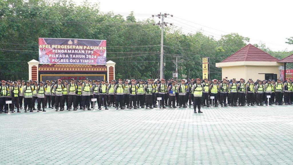 OKU Timur, SKI – Polres OKU Timur menerjunkan sebanyak 298 personel untuk mengamankan jalannya pemungutan dan penghitungan suara Pilkada serentak 2024. Apel pergeseran pasukan digelar di Lapangan Apel Satya Haprabu Polres OKU Timur dan dipimpin langsung oleh Kapolres OKU Timur, AKBP Kevin Leleury, S.I.K., M.Si. Senin, (25/11/2024),