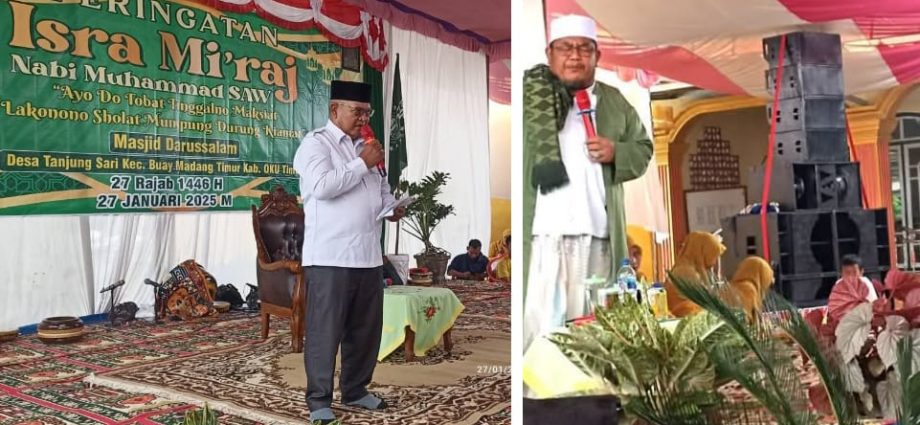 OKU Timur, SKI – Pemerintahan desa Tanjung Sari Kecamatan Buay Madang Timur bersama dengan Ibu-ibu Pengajian dan Majelis Masjid serta Karang Taruna bekerja sama dengan panitia Masjid Darussalam dusun l melaksanakan Peringatan Isra Mi’raj Nabi Besar Muhammad SAW 27 Rajab 1446 Senin (27/01/2025) yang bertemakan”Ayo Do Tobat Tinggalno Maksiat Laksonono Sholat Mumpung Durung Kiamat”.