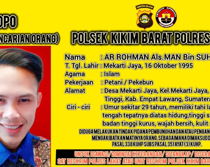 Lahat ,SKI – Polsek Kikim Barat Polres Lahat menerbitkan DPO (Daftar Pencarian Orang) atas kasus dugaan tindak pidana pembunuhan dan atau penganiayaan yang mengakibatkan matinya orang, sebagaimana dimaksud dalam pasal 338 KUHP Subs pasal 351 ayat (3) KUHP berdasarkan Laporan Polisi Nomor : LP / B / 13 / VContinue Reading