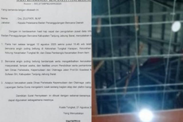 Plafon Kantor Dispapora Tanjab Barat Rusak, Warga Pertanyakan Klaim Angin Topan dan Kesesuaian Data Bencana 2023