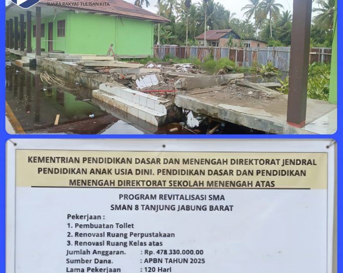 KUALA TUNGKAL, Suarakeadilanindonesia.id – Robohnya salah satu bangunan dalam proyek revitalisasi SMA Negeri (SMAN) 8 Tanjung Jabung Barat (Tanjab Barat), memantik reaksi keras dari masyarakat. Desakan agar aparat penegak hukum segera turun tangan untuk memeriksa seluruh pihak terkait semakin menguat, seiring mencuatnya dugaan pekerjaan tidak sesuai spesifikasi. Sejumlah pemerhati pendidikanContinue Reading