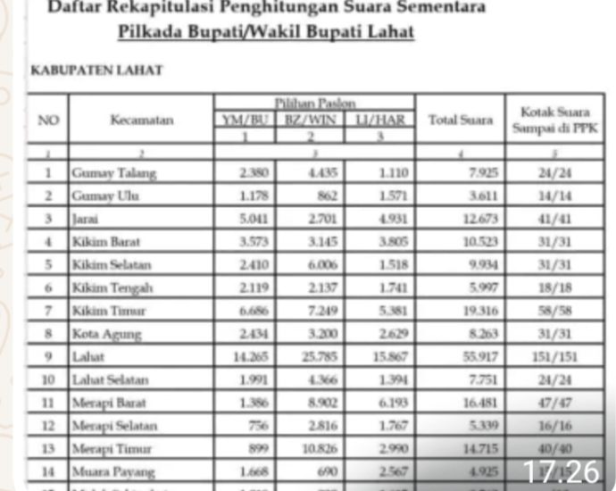 Lahat ,SKI – Luar biasa Pilkada Kabupaten Lahat 2024 terdapat banyak kejanggalan yang sarat dengan berbagai bentuk upaya kecurangan, tidak terkecuali di salah satu desa di Kecamatan Lahat Kota ini tepatnya Desa Manggul, dimana hasil dari rapat pleno tingkat Kecamatan Kota Lahat tingkat indikasi kecurangannya termasuk ugal-ugalan hingga mencapai 98%,Continue Reading