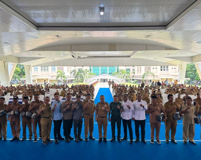 Jelang Pilkada Pjs Bupati OKUT Menghimbau Untuk Netralitas Serta Bagikan Seragam Linmas Dan Bagikan bantuan UMKM