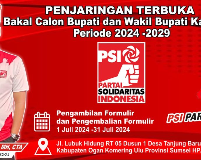 Baturaja, SKI – Dewan Pimpinan Daerah (DPD) Partai solidaritas Indonesia (PSI) Kabupaten ogan Komering Ulu membuka pendaftaran sekaligus menjaring bakal calon Bupati dan calon Wakil Bupati OKU tahun 2024 sebagai partai pedukung.,Pembukaan pendaftaran pasangan calon bupati dan calon wakil bupati yang di mulai hari senin tanggal 1 Juli 2024 sampaiContinue Reading