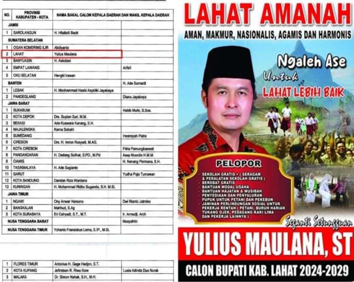 Lahat ,SKI – DPP PDI Perjuangan menerbitkan surat rekomendasi mengusung Calon Bupati dan Wakil Bupati/Walikota dan Walikota se Indonesia. Untuk Lahat, DPP PDI Perjuangan mengusung Yulius Maulana menjadi Calon Bupati Lahat Periode 2024-2029. Sedangkan posisi Calon Wakil Bupati Lahat diserahkan sepenuhnya kepada Yulius Maulana. Keputusan DPP PDI Perjuangan ini sekaligusContinue Reading